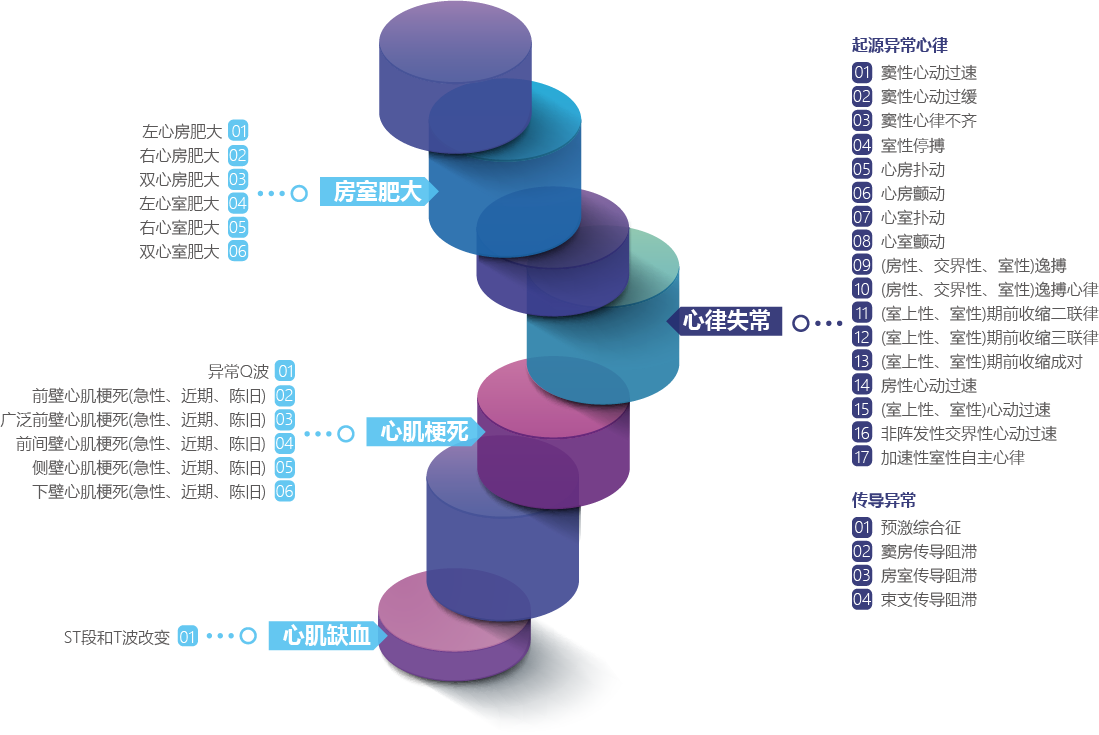 -心律失常、房室肥大、心肌缺血、心肌梗死等分析诊断准确率达95%以上。